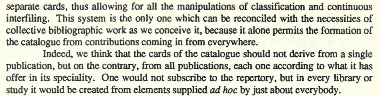 would be cards containing individual "chunks" of information, that would allow "all the manipulations of classification and continuous interfiling." In addition would be needed "a very detailed synoptic outline of knowledge" that could allow classification of all of these chunks of data.
