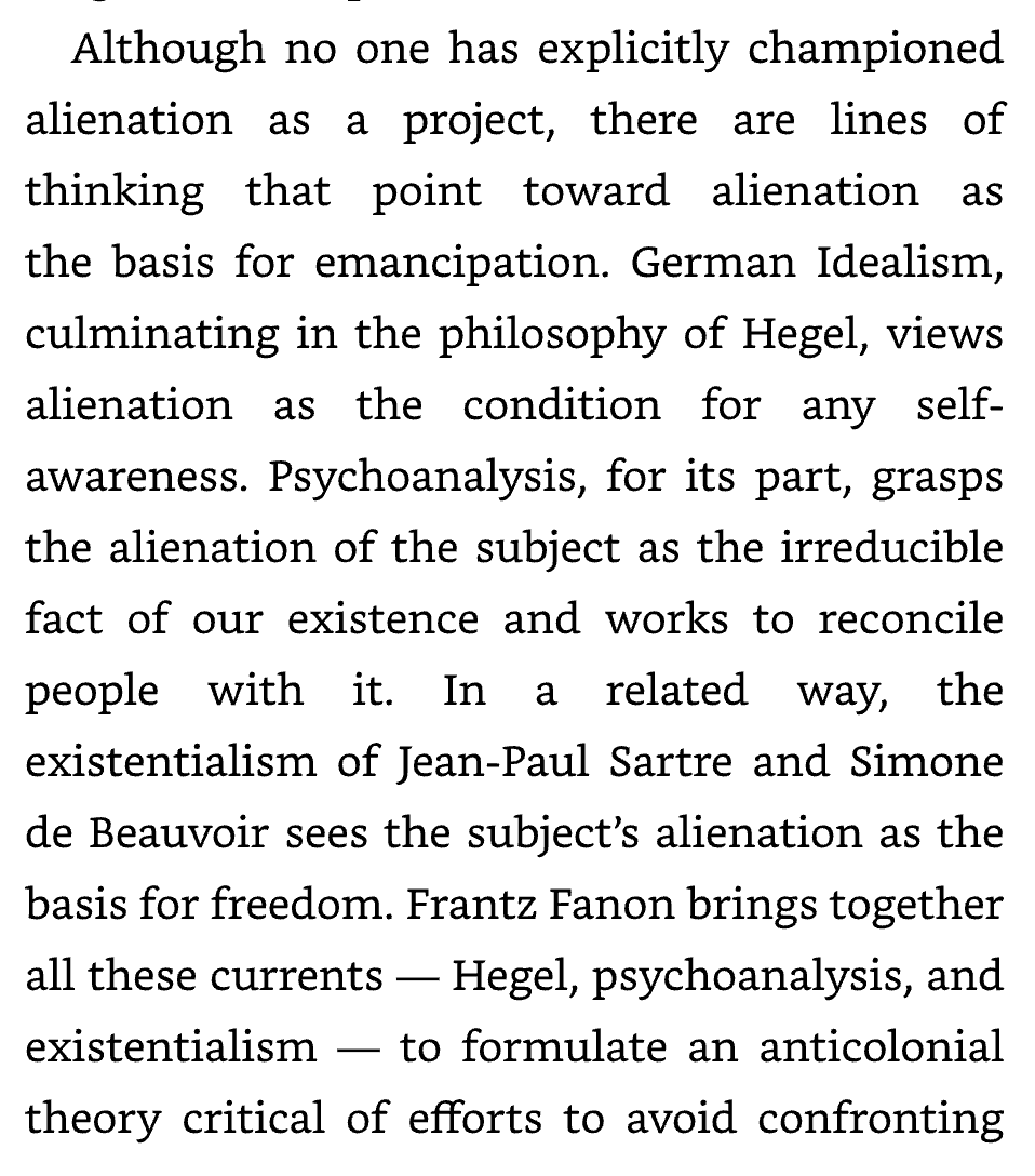 This boiok represents a completely differehnt take on alienation. Its claim is that the effort to overcome alienation is not a radica,l response to the current state of things but a fiaure to see the constitutive power of alienation for us. Instead of trying to overcome alienation and acceded to an unalienated existence, we should rendeem alienation as an existential and political program. Alienation is emancipation. (p9)