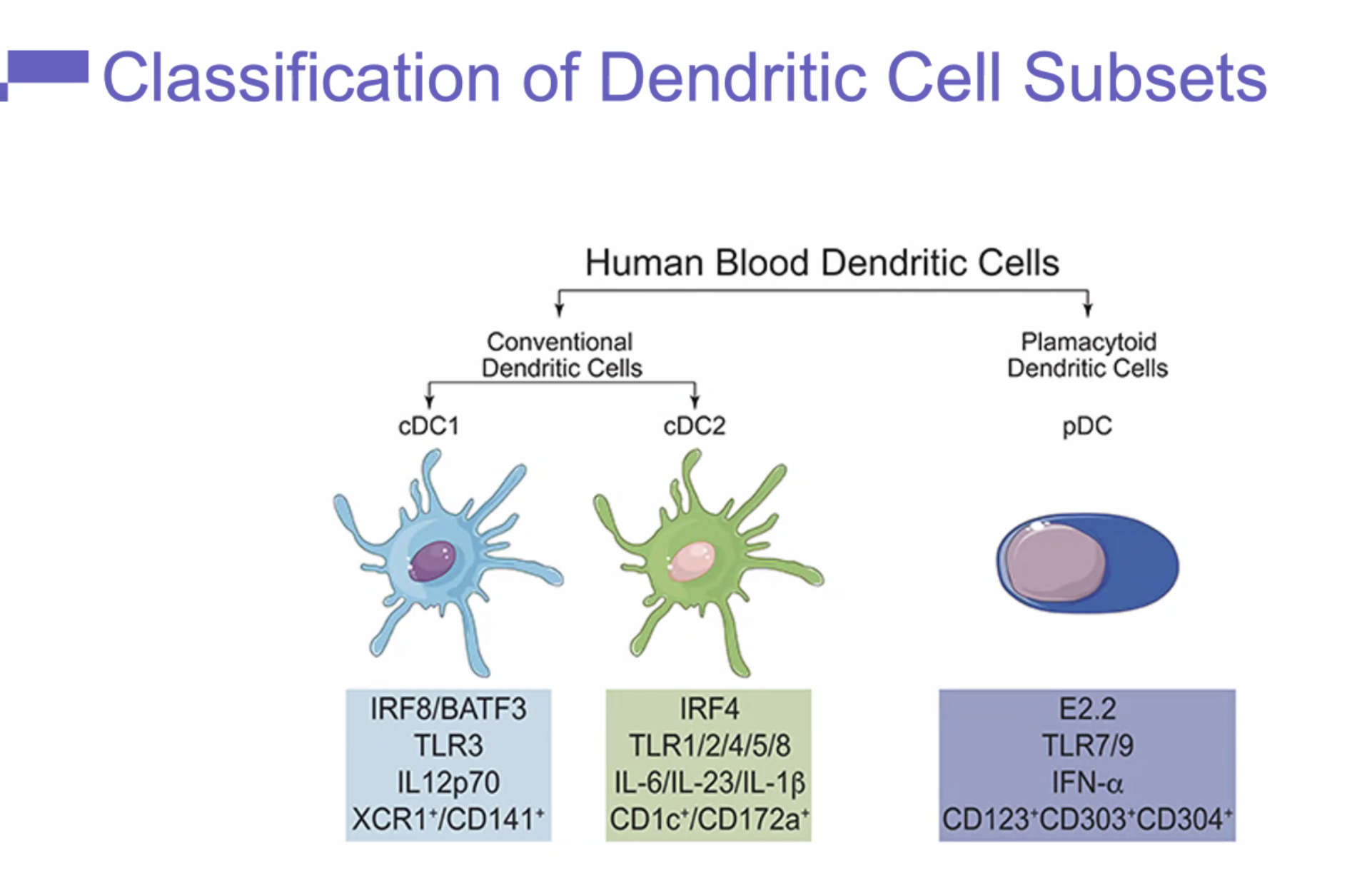 - Plasmacytoid DCs have x on their surface. Determines T-cell response IL-12p70 (Deena favorite) turns T-cell into Th1 cell, good for attacking cancer.
